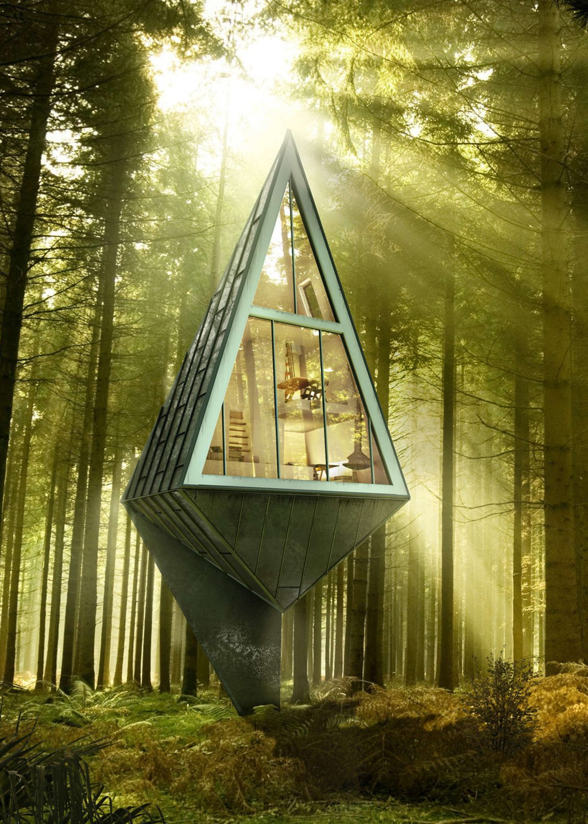 At last but not least. Dit opvallende huis lijkt net buitenaards, dat is geland uit een film. De vorm van het huis is een punt en bestaat aan de voorkant volledig uit glas. De locatie van het huis is in het bos en daar is ook de kleur op afgestemd. Wil jij je graag helemaal terugtrekken? Dan zit je hier goed!