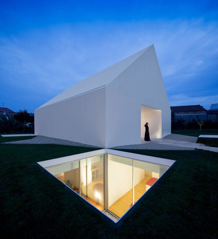 Bestaat een huis onder de grond met glaswerk? Zeker, bekijk onderstaand huis! Een prachtig, wit punthuis zonder ramen boven de grond. In de grond bevindt zich een gat, waar de ramen zich bevinden en waar dus zonlicht naar binnen komt. Mocht je graag windstil in je tuin zitten, dan is dit huis zeker iets voor jou.