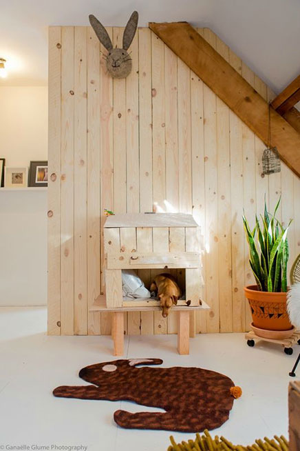 Het Kura bed is volledig bekleed met berken multiplex planken, waardoor je het praktisch niet meer herkend. Dit komt ook doordat de opening aan de onderkant dicht is gemaakt met deuren, zodat Stanley daar een hut kan bouwen. Daarnaast is er ook een hoofdbord, een vaste trap en wat plankjes toegevoegd aan de hoogslaper. Het resultaat is geweldig!