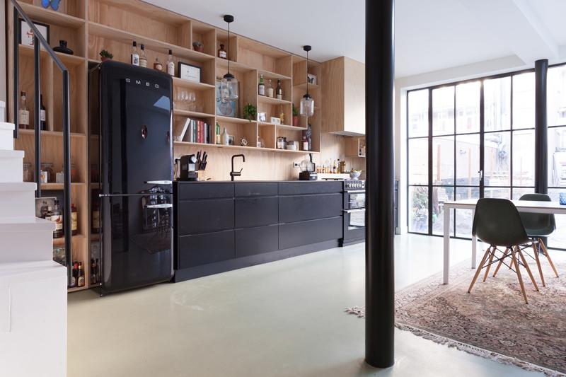 In deze stoere keuken is er gekozen voor moderne lage zwarte keukenkasten en een vrijstaande zwarte Smeg koelkast. Maar wat erg bijzonder is, is dat er ook een grote wandkast op maat is gemaakt, inclusief een ombouw voor de koelkast. De wandkast bestaat uit verschillende open vakken, waar je leuke spullen in kunt plaatsen. Super nice. Klik hier om meer te zien.