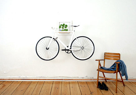 Dit idee kwamen we tegen in een klein appartement van slechts 50m2. Daar hebben ze de fiets niet aan de muur opgehangen, maar onder de trap. Ook dat ziet er heel stoer uit!